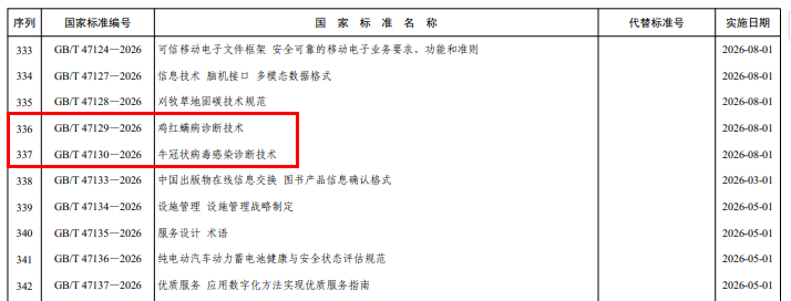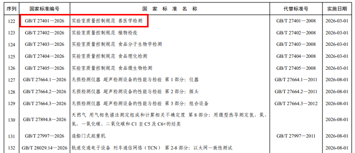 2026年1月28日,国家市场监督管理总局批准发布了《实验室质量控制规范 兽医学检测》《马流感诊断技术》《鸡红螨病诊断技术》《牛冠状病毒感染诊断技术》四项兽医领域国家标准。