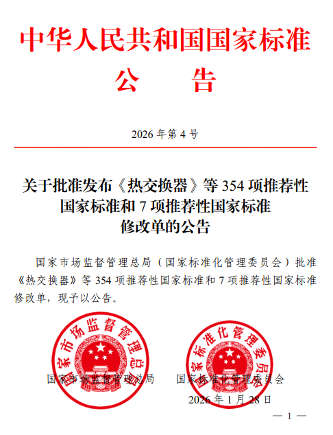 通知原文:关于批准发布《热交换器》等354项推荐性国家标准和7项推荐性国家标准修改单的公告.pdf