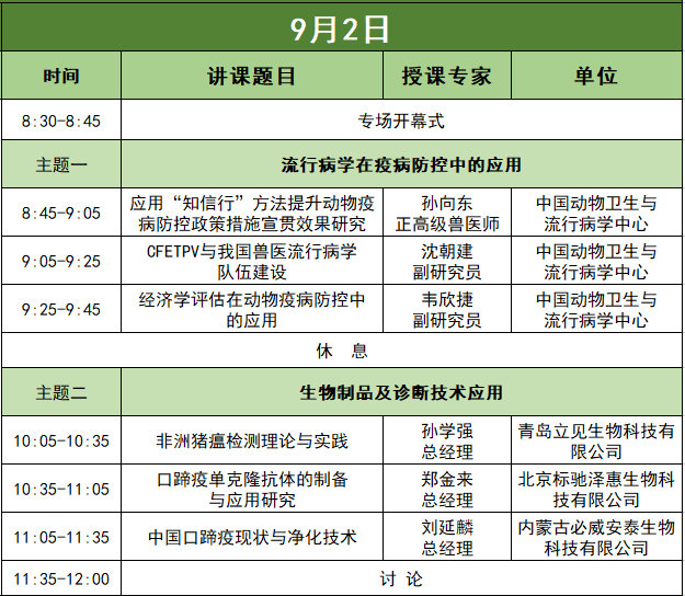 开幕式主题报告将围绕农业农村部重点工作,邀请有关部门领导就《国家兽医法规导读》《我国动物卫生风险评估工作》《我国兽药产业发展与展望》《非洲猪瘟检测诊断技术研究与应用》作报告。