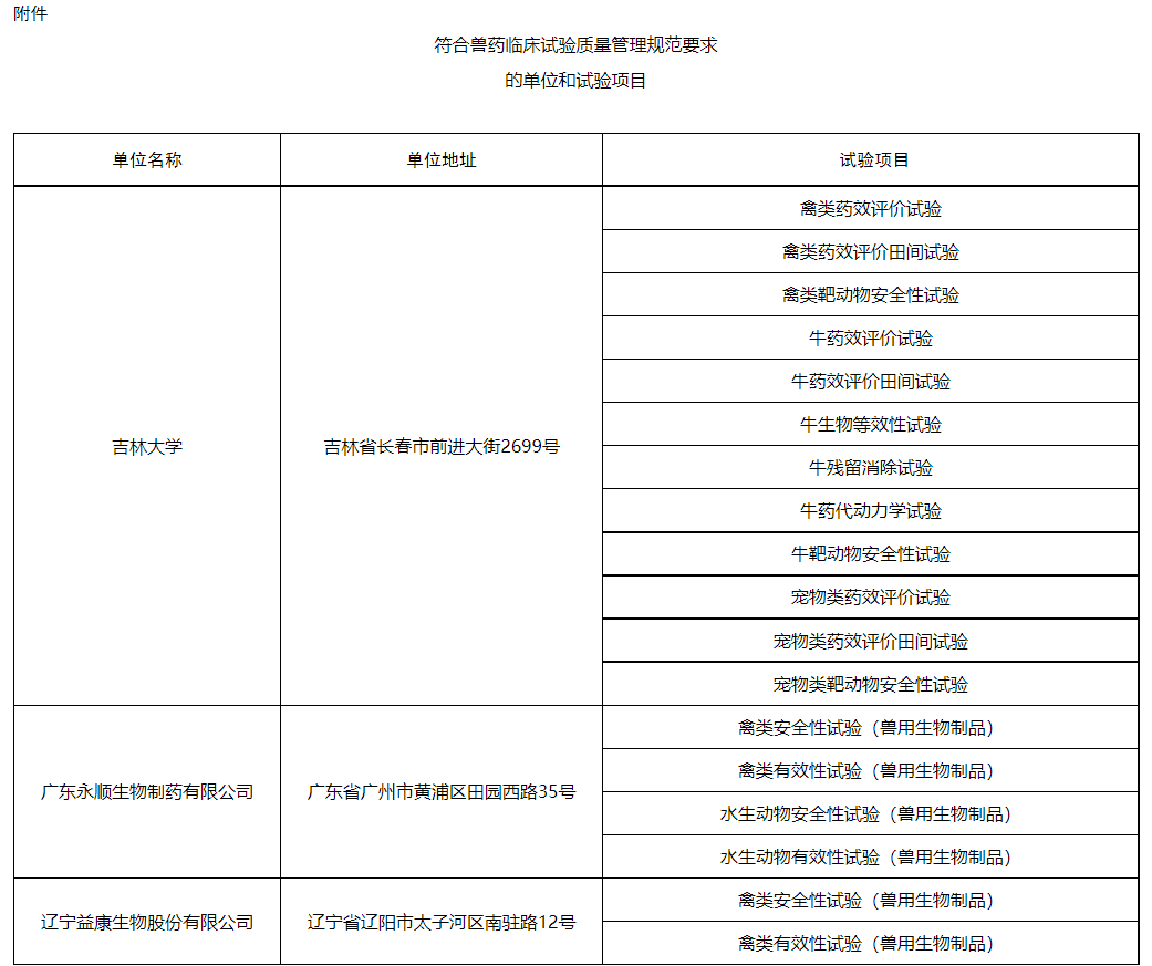 附件:符合兽药临床试验质量管理规范要求的单位和试验项目