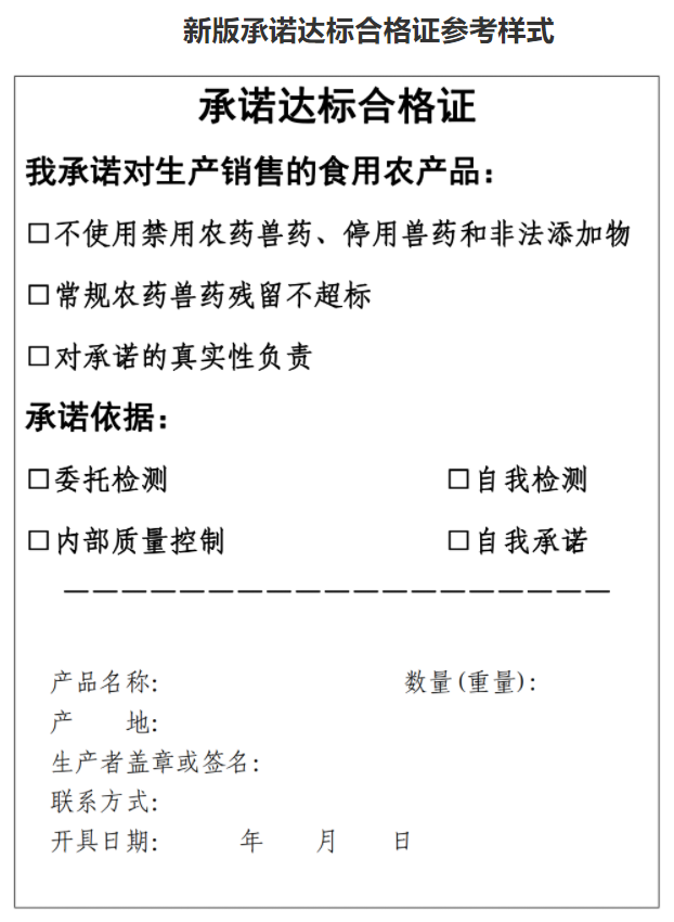 (一)统一使用新版承诺达标合格证样式。在试行过程中,合格证样式和内容不断完善,各级农业农村部门对此也做了积极探索。为进一步明确制度的核心要求与目标,我部将合格证名称由“食用农产品合格证”调整为“承诺达标合格证”,并对合格证参考样式做了进一步优化,新版样式(见附件1)主要有以下调整。