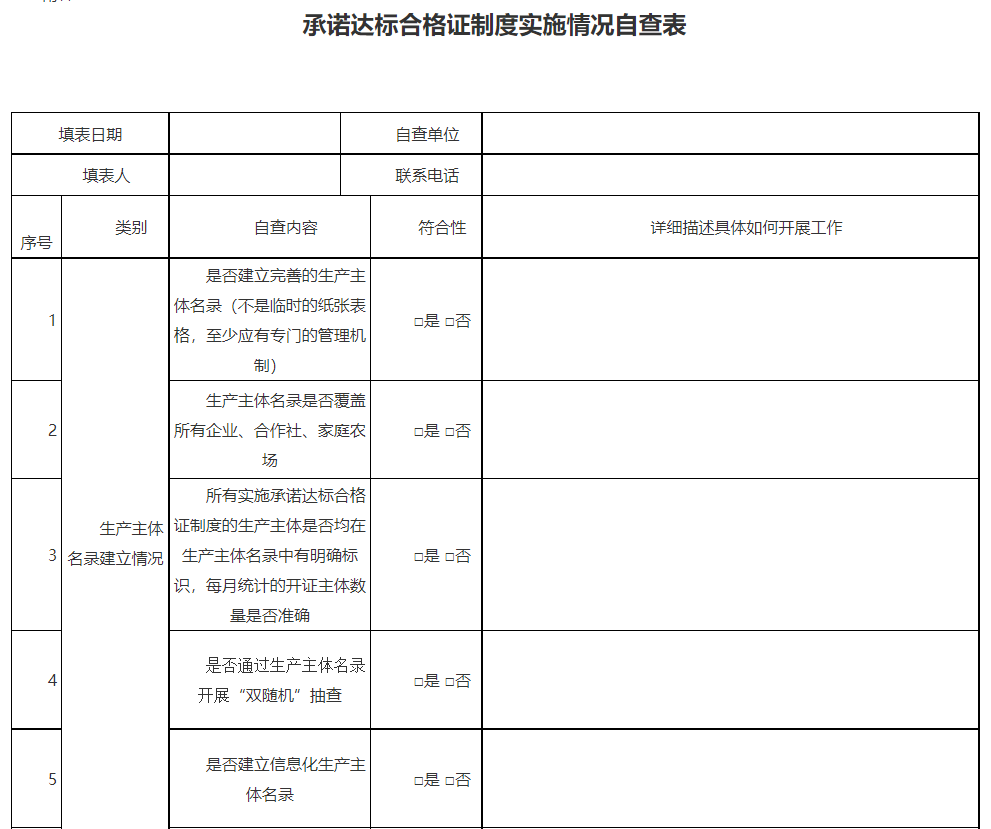 各级农业农村部门要高度重视承诺达标合格证制度试行工作,加快推进步伐,提升农产品质量安全监管水平。2021年底前,省级农业农村部门要组织开展一次自查(自查表详见附件3),重点自查生产主体名录是否健全,开证主体日常监管和市场查验等情况,督促指导各地加快推进实施,确保试行工作落实到位。2021年12月15日前,请将本省份自查情况及承诺达标合格证制度试行情况总结报送我部农产品质量安全监管司并抄送农业农村部农产品质量标准研究中心。工作过程中,可以随时以新闻报道、工作简报等形式报送有关经验和亮点成效。