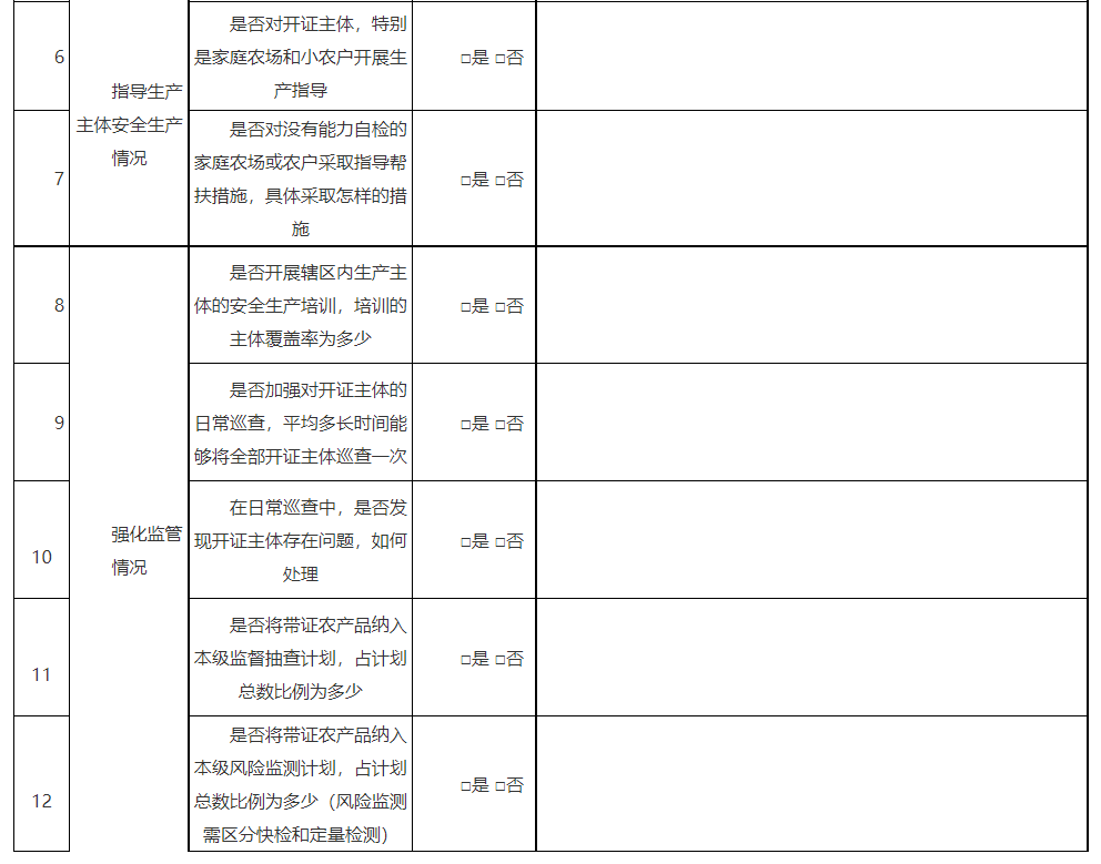 (六)加大日常巡查检查力度。乡镇农产品质量安全监管公共服务机构要将承诺达标合格证制度的推行纳入监管服务范围,发挥好农产品质量安全监管“最初一公里”的作用。加强对开证生产主体的日常巡查检查,每年对试行主体的巡查要达到全覆盖。重点检查主体是否落实《农产品质量安全法》规定和《农产品生产主体质量安全控制基本要求(试行)》(附件2),是否按照要求持续规范开具承诺达标合格证。要查看生产主体留存的承诺达标合格证开证记录,对检查过程中发现的问题及时督促整改。