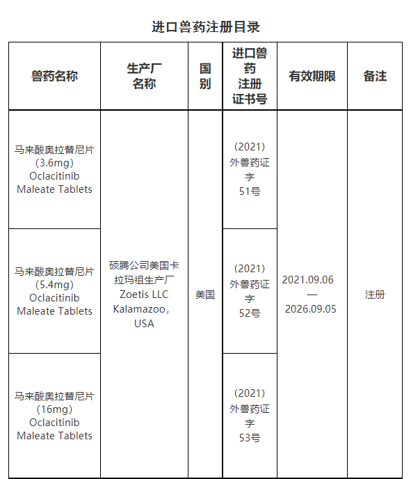 根据《兽药管理条例》和《兽药注册办法》规定,经审查,批准硕腾公司美国卡拉玛祖生产厂生产的马来酸奥拉替尼片在我国注册,核发《进口兽药注册证书》,并发布产品质量标准、说明书和标签,自发布之日起执行。