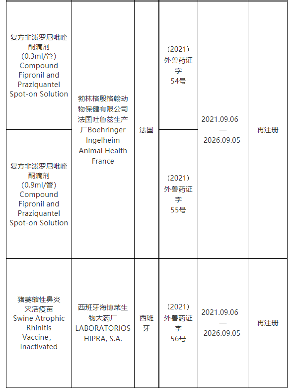 批准勃林格殷格翰动物保健有限公司法国吐鲁兹生产厂等3家公司生产的复方非泼罗尼吡喹酮滴剂等3种兽药产品在我国再注册,核发《进口兽药注册证书》,并发布修订后的产品质量标准、说明书和标签,自发布之日起执行。此前发布的该产品质量标准、说明书和标签同时废止。