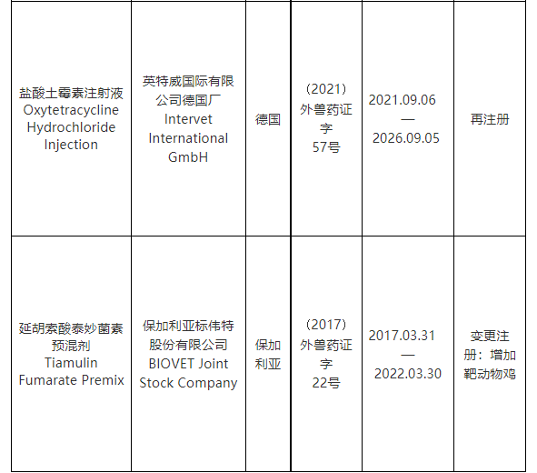 批准保加利亚标伟特股份有限公司生产的延胡索酸泰妙菌素预混剂在我国变更注册,发布修订后的产品质量标准、说明书和标签,自发布之日起执行。此前发布的该产品质量标准、说明书和标签同时废止。