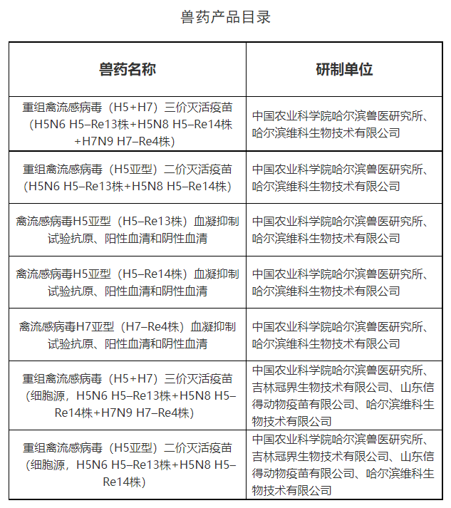 根据《兽药管理条例》和《兽药注册办法》规定,我部组织制定了重组禽流感病毒(H5+H7)三价灭活疫苗(H5N6 H5–Re13株+H5N8 H5–Re14株+H7N9 H7–Re4株)等7种兽药产品工艺规程、质量标准、说明书和内包装标签,现予发布,自发布之日起执行。