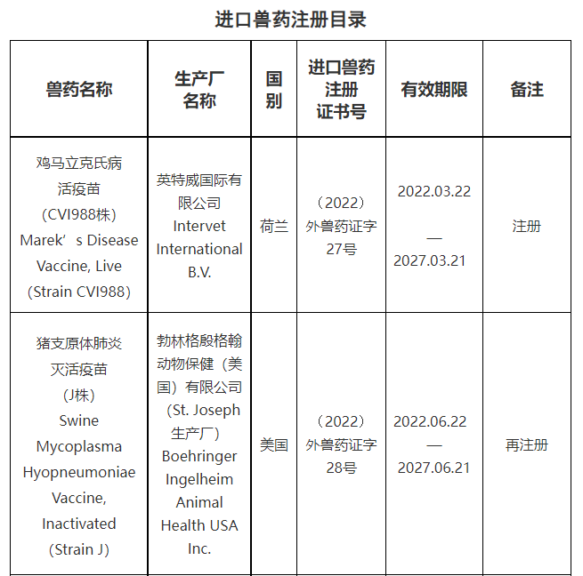 批准勃林格殷格翰动物保健(美国)有限公司(St. Joseph生产厂)等2家公司生产的猪支原体肺炎灭活疫苗(J株)等2种制品在我国再注册,核发《进口兽药注册证书》,并发布修订后的产品质量标准、说明书和标签,自新核发的《进口兽药注册证书》生效之日起执行,此前发布的该2种制品质量标准、说明书和标签同时废止。