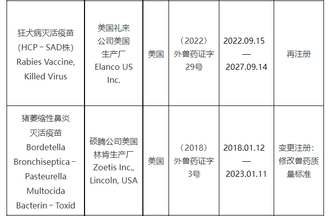 批准硕腾公司美国林肯生产厂生产的猪萎缩性鼻炎灭活疫苗在我国变更注册,发布修订后的产品质量标准、说明书和标签,自发布之日起执行。此前发布的该产品质量标准、说明书和标签同时废止。