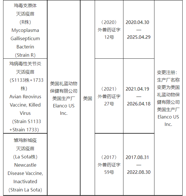 批准美国礼蓝动物保健有限公司美国生产厂生产的鸡毒支原体灭活疫苗(R株)等3种制品在我国变更注册。
