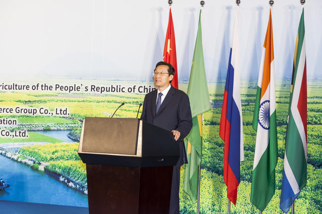 中华人民共和国农业部部长韩长赋在金砖国家农业合作论坛上作主旨演讲。 农业部网站记者 李卫东 摄