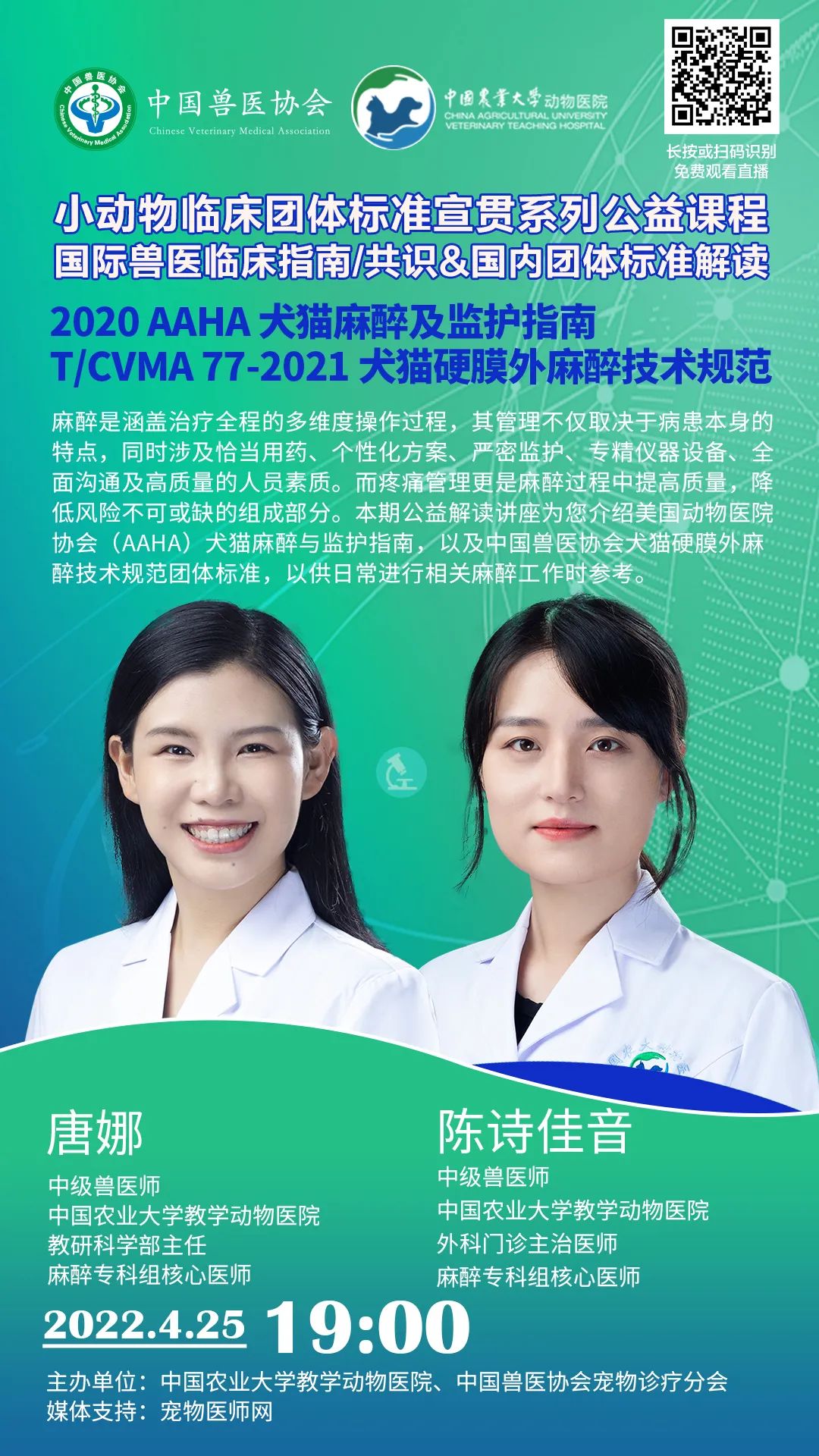 课程名称:《小动物临床团体标准宣贯系列公益课程 | 2020 AAHA 犬猫麻醉及监护指南 & T/CVMA 77-2021犬猫硬膜外麻醉技术规范 》