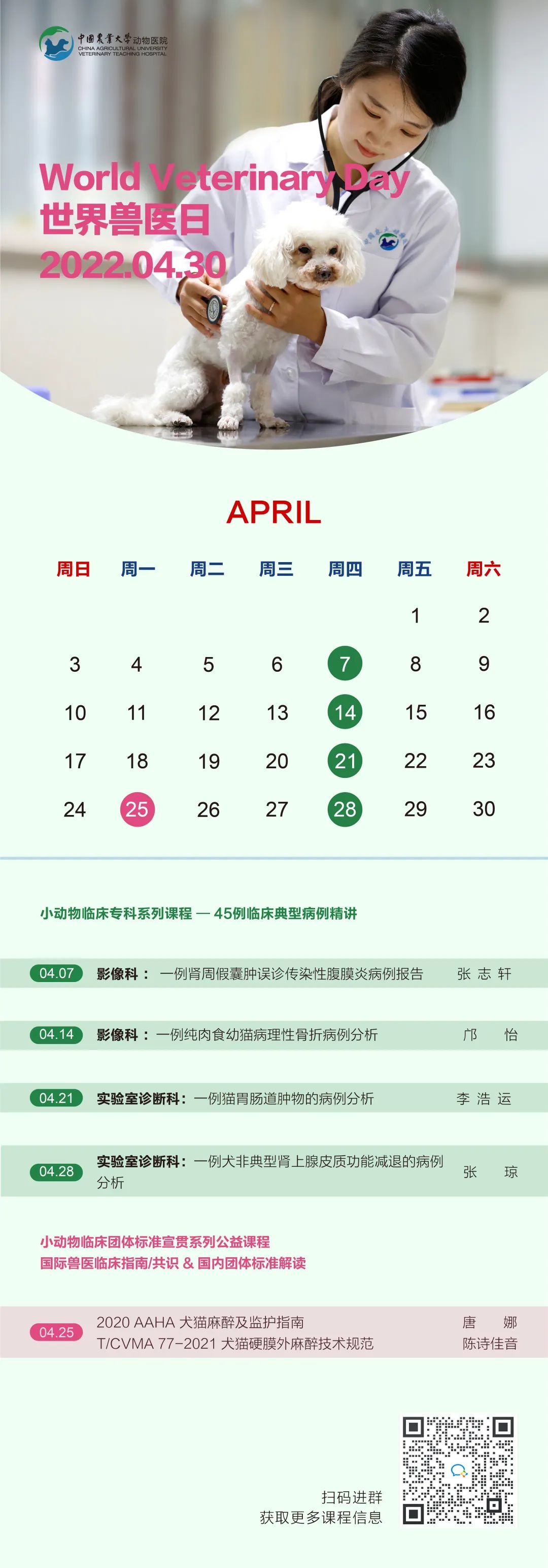 Ps. 2021年度专科系列50余期公益课程将同步开启回放权限,您可扫描上方中国农业大学动物医院线上学习平台,即刻订阅收看