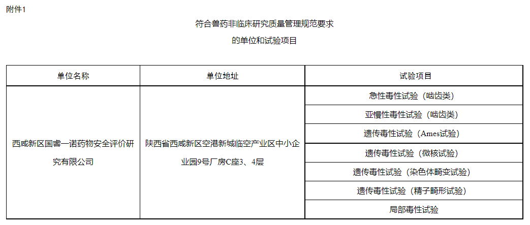 附件:1.符合兽药非临床研究质量管理规范要求的单位和试验项目
