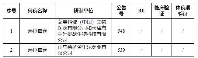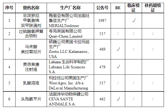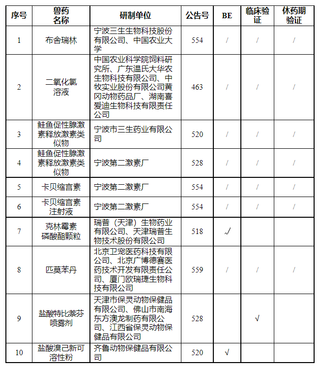 备注:1.农业农村部公告第486号发布的托曲珠利内服混悬液、公告第539号和第548号发布的泰拉霉素注射液、公告第554号发布的布舍瑞林注射液、公告第559号发布的匹莫苯丹咀嚼片、公告第575号发布的头孢泊肟酯片,均为仿制药,需与原研品进行比对。