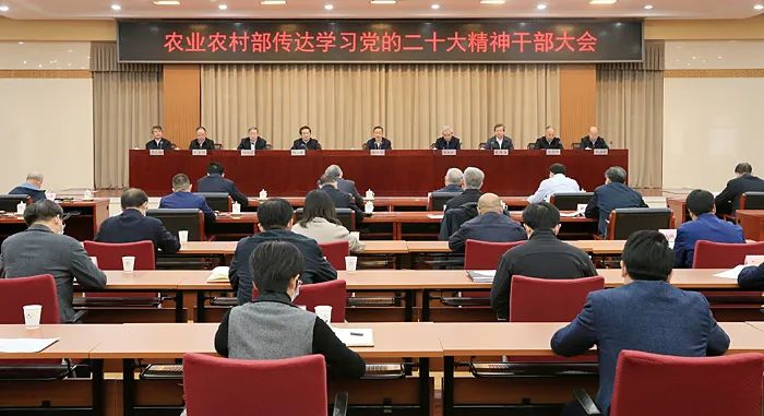 会议要求,部系统各级党组织要把学习宣传贯彻二十大精神,作为当前和今后一个时期的首要政治任务,迅速组织传达学习,通过理论中心组、专家辅导、交流研讨等形式,组织开展具有三农特色、形式丰富多样的学习交流活动,分期分批、分层分级开展培训轮训,面向农村基层、农民群众、三农系统开展宣传宣讲,掀起学习宣传贯彻的热潮,要引导党员干部原原本本学懂、全面系统弄通、不折不扣做实,推动党的二十大精神在三农系统落实落地、扎根生根。要把学习贯彻二十大精神同谋划明年和今后一个时期三农工作紧密结合起来,组织开展全局性、关键性、战略性重大问题研究。当前要毫不放松抓好秋收,保质保量完成秋种,高质量完成高标准农田建设任务,切实保障“菜篮子”产品稳定供给,扎实做好安全生产和新冠肺炎疫情防控工作。