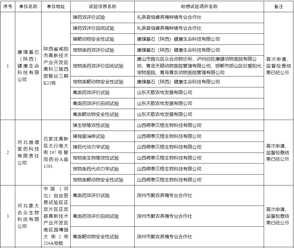 中国农业大学等8家单位申请增加兽药GCP动物试验场所、华中农业大学等4家单位申请变更兽药GCP项目负责人、成都史纪生物制药有限公司申请变更兽药GCP动物试验场所、豪威生物科技有限公司申请变更兽药GCP机构负责人、陕西诺威利华生物科技有限公司申请变更兽药非临床研究机构负责人,经我局组织资格确认,符合相关要求,详细信息见中国兽药信息网“兽药GLP/GCP监督检查”专栏。