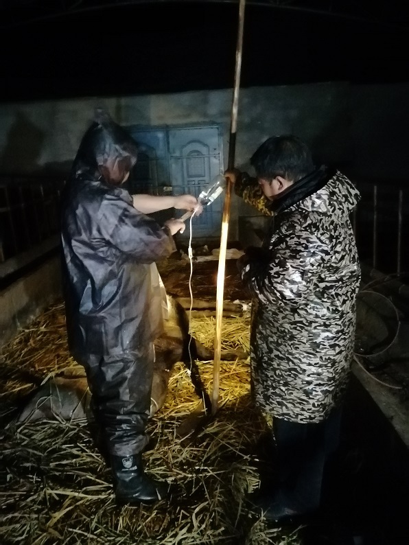 图3:夜幕下的“黑衣天使”——畜牧兽医人员为病牛输液